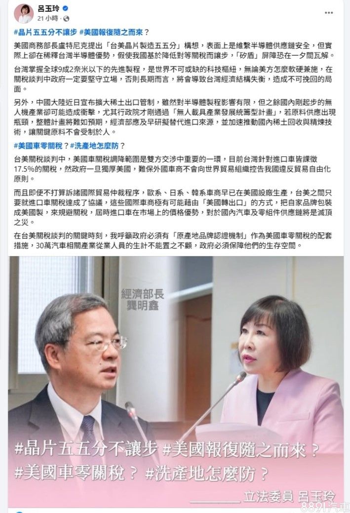 另外,立委呂玉玲質詢提到,台灣不應獨厚美國車降進口關稅,難保外國車商向世界貿易組織控告我國違反貿易自由化原則。同時也呼籲政府必須有「原產地品牌認證機制」作為美國車零關稅的配套措施,以免車廠藉由美國製來規避關稅,屆時進口車在市場上的價格優勢,對於國內汽車及零組件供應鏈將是一大衝擊。(圖/翻攝立委呂玉玲FB)