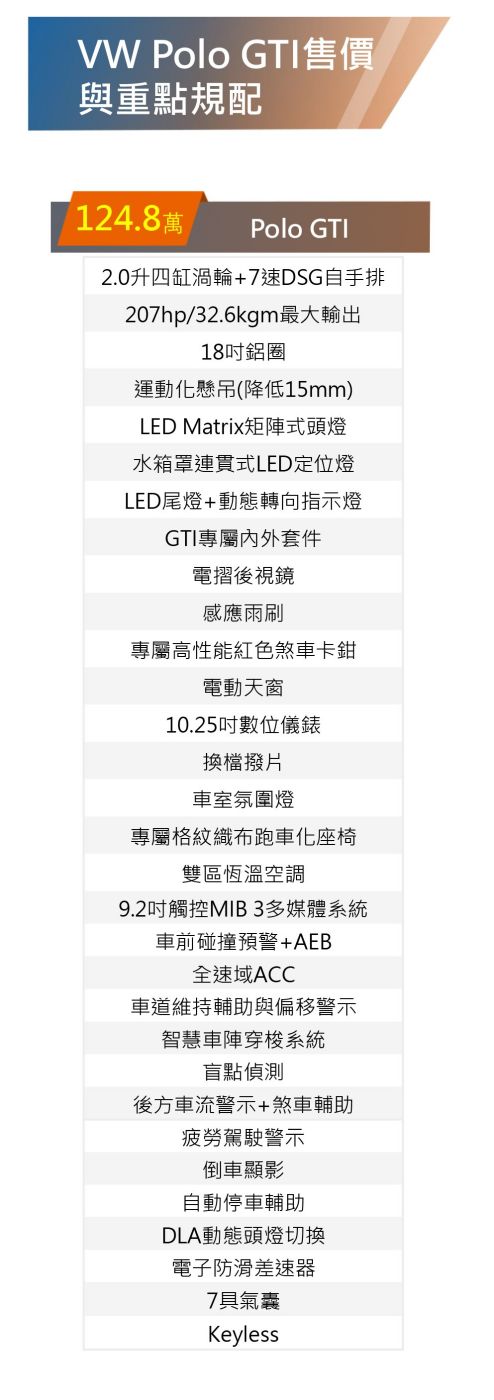 Polo GTI於今日(11/3)正式在台上市,開價124.8萬元,據了解採限量供應,配額50台。新車搭載2.0升四缸渦輪動力+7速雙離合器自手排,繳出油耗15.8km/L,具備207hp/32.6kgm最大輸出,0~100km/h加速6.5秒、極速可達240km/h。並搭配GTI專屬運動化懸吊系統(車身降低15mm)與駕駛模式選擇,提高過彎穩定性。