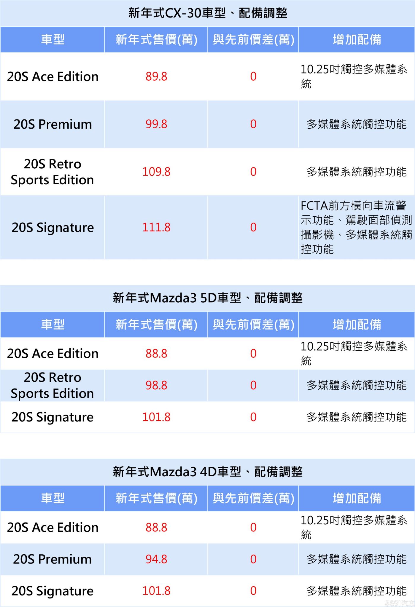 2026年式CX-30同樣延續4車型編成,售價未變,入門的Ace Editio車型升級10.25吋多媒體系統;Signature版本追加FCTA前方橫向車流警示功能,以及支援駕駛疲勞警示功能的駕駛面部偵測攝影機,成為全車系標配的10.25吋螢幕,也均導入觸控功能,不過Ace Edition、Premium、Signature都取消了雙色運動化座椅。