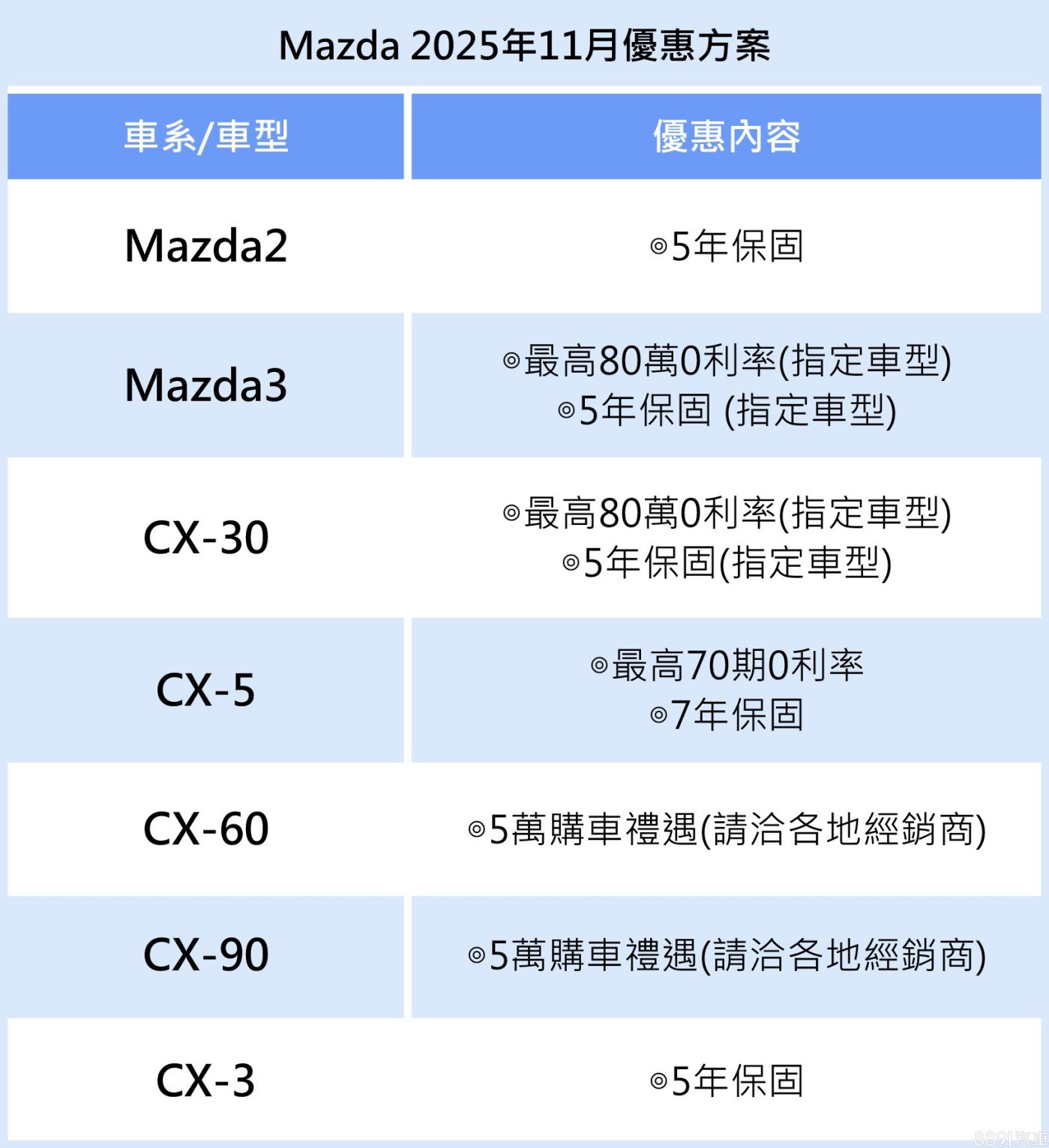 同時,原廠亦推出11月購車方案,入主熱銷休旅CX-5享7年原廠保固及70期高額0利率,還可適用貨物稅減徵新制最高10萬元減免;入主CX-60或CX-90,亦可享有5萬元購車禮遇,其餘車款則提供5年保固或高額0利率分期優惠。