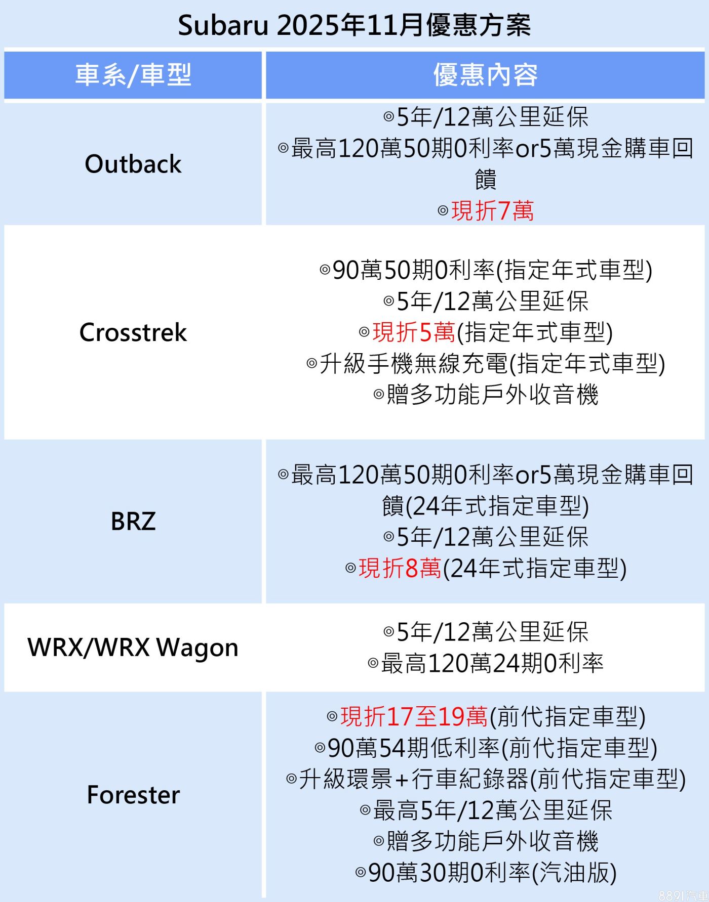 本月凡入主Subaru全車系指定車型,均可享5年延長保固,並針對不同車款,給出最實惠的現金折價,或是配備升級,舉例來說:25年式Crosstrek現折5萬,再享90萬50期0利率並升級專用無線充電裝置;BRZ指定年式車型現折8萬;Outback現折7萬等。