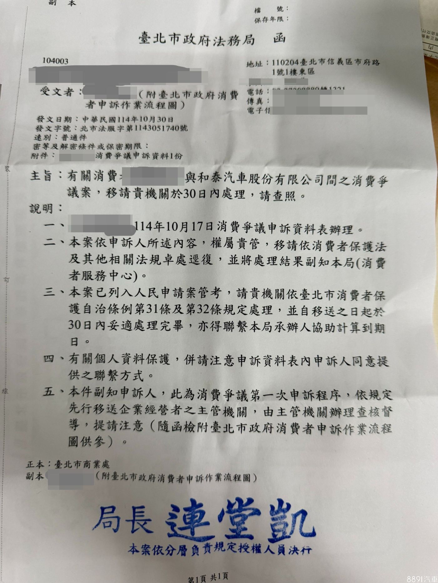 不過對於和泰汽車提出的補償方案,部分車主仍表達不滿,據了解有20幾位車主聯合向消保會提出消費爭議申訴,消保會於10/30發文台北市商業務,由主管機關辦理查核督導,依規定需自移送日起30天內處理完畢,預計月底前就會有雙方調解的答案。