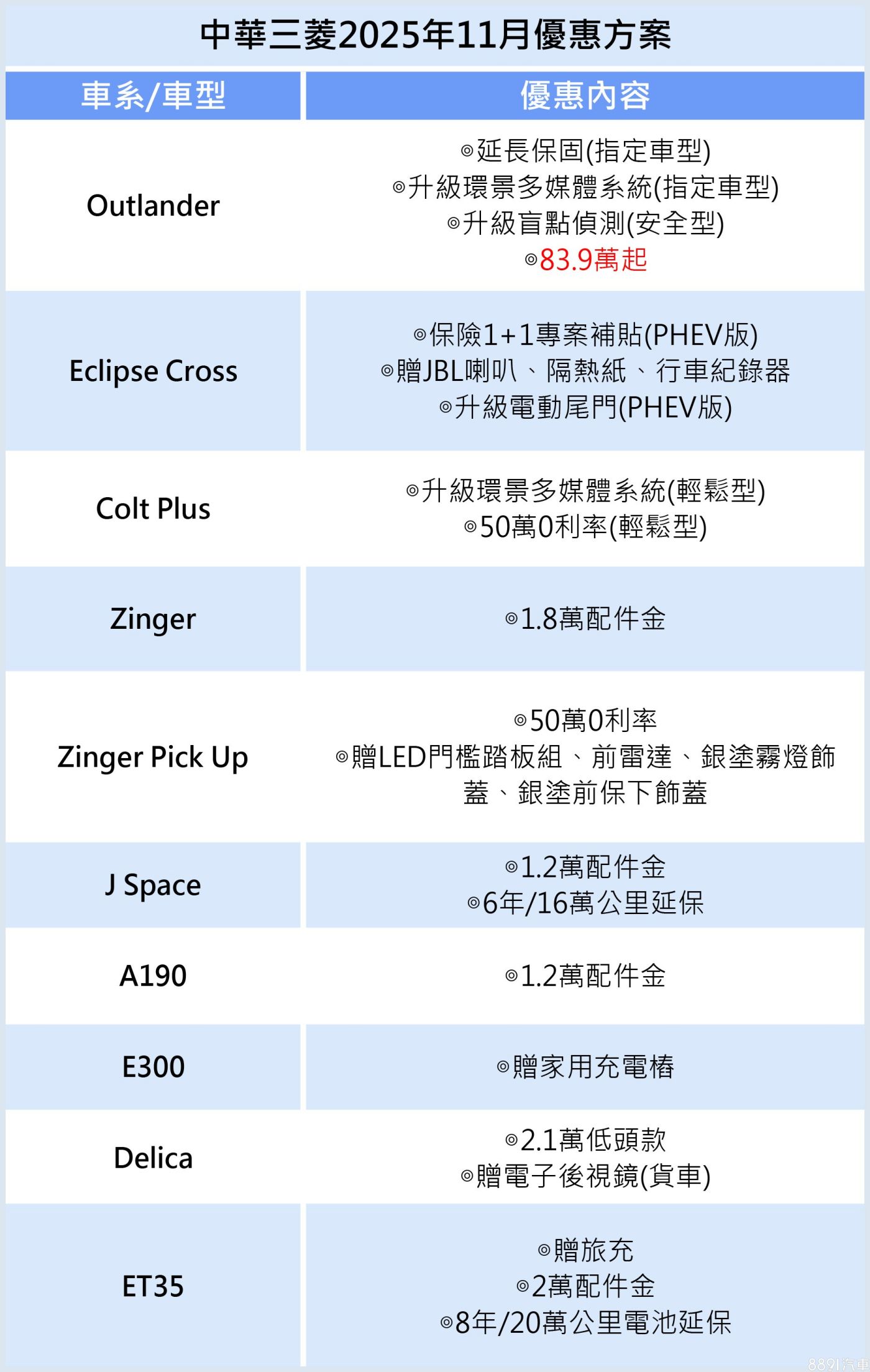 另中華三菱亦同步推出11月購車方案,針對當紅車款如Zinger、J Space,均祭出配件金,前者1.8萬、後者1.2萬,後者再加贈6年/16萬公里延保。頭家好朋友Zinger Pick Up,除了適用50萬0利率優貸,加贈LED門檻踏板組、鍍鉻水箱護罩、銀塗霧燈飾蓋、銀塗前保下飾蓋等,讓外觀扮相更獨特。