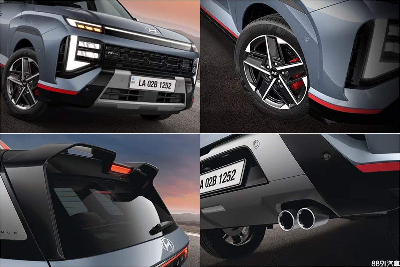 第二代Hyundai Venue率先於印度發表,「N Line」運動版也緊接發表,水箱護罩加入框形與蜂巢狀交織的格柵、N Line徽飾,保桿造型修飾得更為俐落,搭配環繞車身的紅色飾條。