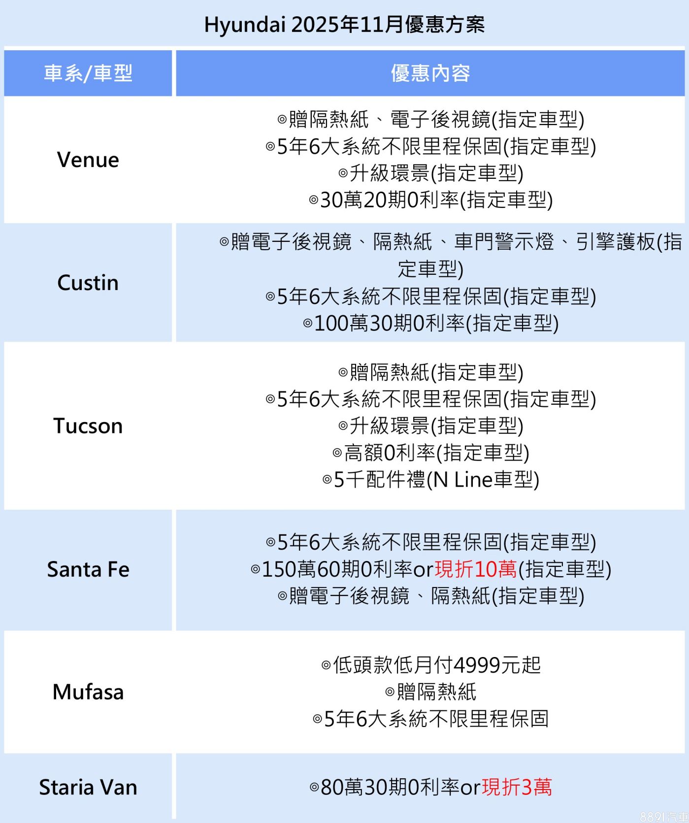 身受家庭買家歡迎的Custin,本月入主指定車型可獲得電子後視鏡、隔熱紙、車門警示燈、引擎護板等多項實用升級,並享100萬30期0利率方案;主力休旅 Tucson指定車型加贈隔熱紙、升級環景影像系統,N Line運動化車型更加碼 5千元配件禮。