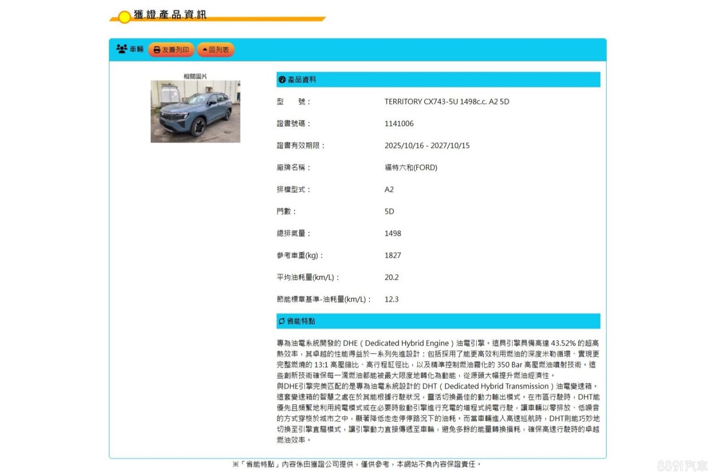 自政府核發資料,已揭曉國產Territory客車及客貨車認證都有,並以汽油與油電「雙動力」應戰,預計供應汽油2車型、油電3車型,將成為繼RAV4、Tucson之外的油電中型休旅新選擇。汽油版採1.5升四缸渦輪+7速自排變速箱,具備160hp/25.2kgm,平均油耗13.1km/L。