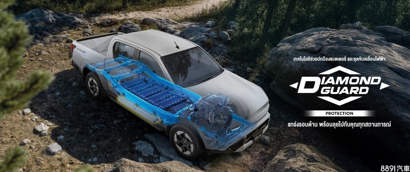 電動版Hilux採前後雙馬達、e-Axle電子四驅配置,前後軸馬達分別出力112hp/20.9kgm與176hp/27.3kgm,綜效最大馬力可達196hp,搭配59.2kWh鋰電池組,支援最大125kW直流快充,官方稱具備至少300km純電行駛里程。另外,原廠稱電動版Hilux採用「Diamond Guard」鑽石結構設計,強化電池與馬達的保護力。