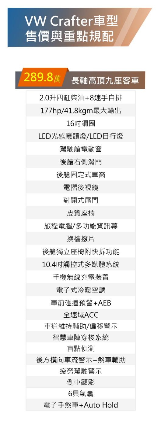 小改款Crafter提供長軸高頂九座客車單一車型,正式售價289.8萬元,較預售價下修9萬元,新車重點在於導入符合Level 2標準的駕駛輔助科技,以及內裝數位化。