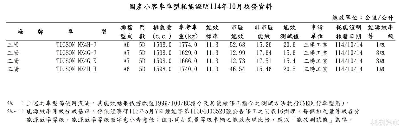 10月耗能證明核發資料,國產車沒啥驚喜,Hyundai為了搶新貨物稅政策福利,於9/12啟動接單、預計11月開始交車的Tucson L客車版,持續補上油耗數據,1.6汽油渦輪繳出15.4~15.6km/L平均油耗,1.6渦輪油電則為20.5~20.6km/L。