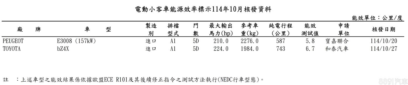名單最大亮點會是Peugeot E-3008,在新一代3008於7月登台後,看來電動版也準備報到了。自自核發資料顯示E-3008,最大輸出210hp,以NEDC標準測出587km純電里程、5.8km/kWh電耗值,參考海外配置,其採前置單馬達+73kWh電池組。