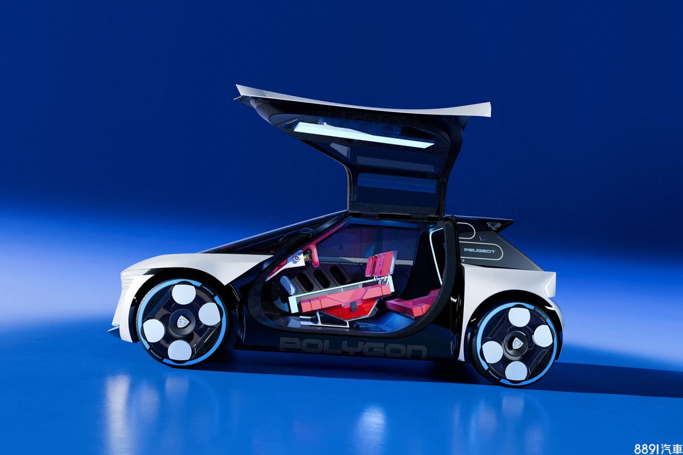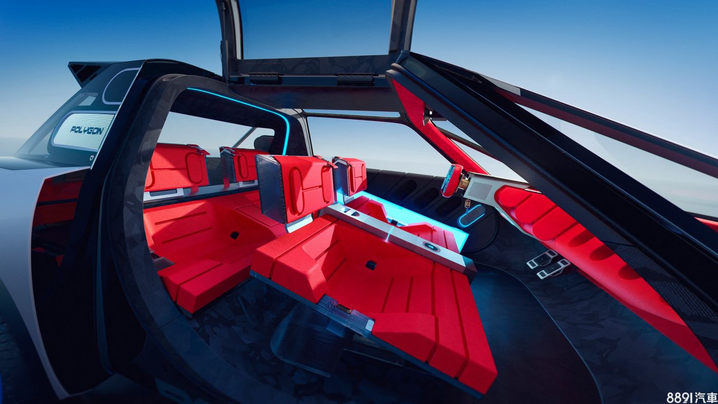 內裝材質則展現Peugeot對永續方向的堅定態度。車艙多處以回收素材重新加工而成,包括以報廢輪胎粉末製作的塗層,以及由舊車座椅再生紡織成型的布料。座椅本體則以3D列印的回收材質製成,同時以三組件結構減少零件數量,使內裝不僅輕量化,也降低製程能源消耗。為了呈現更前瞻的個性化能力,Polygon Concept 的 Hypersquare控制器、輪圈蓋與部分飾板皆可快速替換,駕駛能依照喜好打造專屬風格。