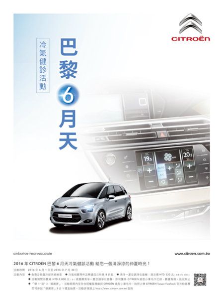 Citroen總代理寶嘉聯合自2016年6月1日起至7月30日止,於CITROËN全台授權服務廠舉辦免費的2016 Citroen巴黎6月天冷氣健診活動,並提供冷氣及濾芯相關零件優惠價格8折起,而選購「清淨一夏空氣淨化套餐」則享清涼價520元;或消費滿2000元,即可獲得Citroen巴黎6月天季節限定造型毛巾乙組,另外還有拍照抽獎等活動。