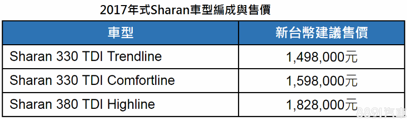 新年式Sharan車系取消了原有的280 TSI Trendline汽油車型,而新增最大輸出為184hp/38.8kgm的380 TDI Highline車款,2017年式Sharan車系改由330 TDI Trendline、330 TDI Comfortline與380 TDI Highline 3種柴油車型組成,起售價則分別為149.8、159.8、與182.8萬元,車型也依等級不同,個別在配備上做不同程度的升級,最高幅度達20萬元。