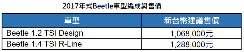 2017年式Beetle保留1.2 TSI Design車型,而將原本的1.4 TSI Sport改為1.4 TSI R-Line,起售價分別為106.8與128.8萬元,與舊年式的1.2 TSI Design與1.4 TSI Sport車型相比,各調降了4萬元與17萬元。