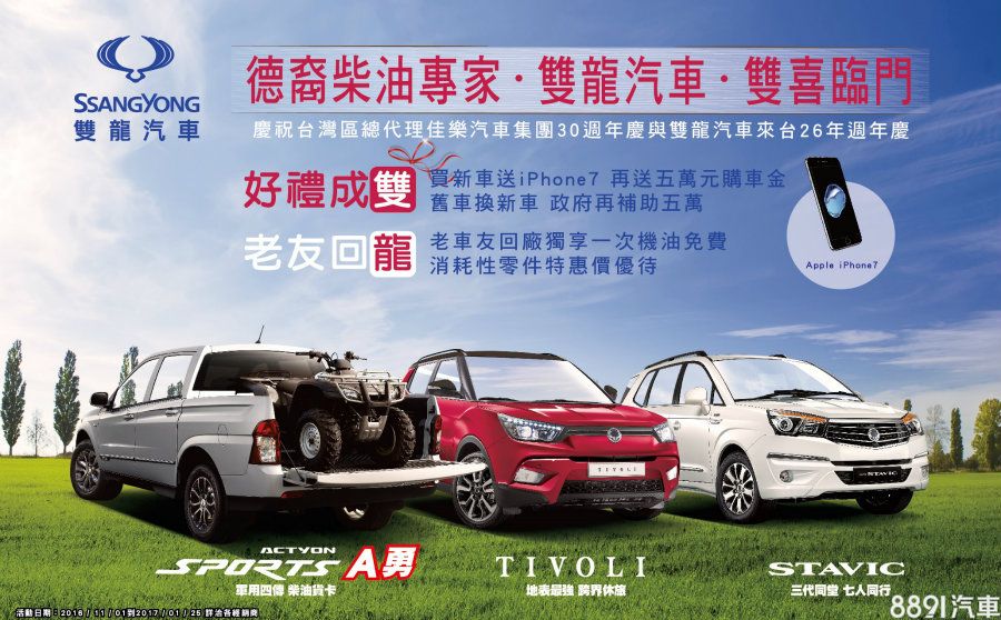 佳樂汽車集團旗下永嘉雙龍自第四季11月正式啟動的「好禮成雙‧老友回龍」,內容包含:「好禮成雙」專案,只要入主全車系不限車款車型,即贈iPhone7智慧手機,再送5萬元購車金大紅包,與政府加碼的舊換新5萬元補助合計可達10萬元;此外「老友回龍」活動針對新舊車主,同步實施回廠即免費贈送一次機油,另有消耗性零件特惠價優待。