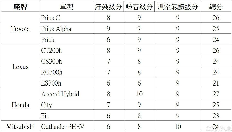 除了節能自居的Hybrid動力,另外有兩款傳統汽油車型,則是採相同動力架構的Honda City與Fit,分別達到25以及23級分,不論噪音或是溫室氣體測試都有良好水準,相較下,市場同級對手Toyota Vios(16級分)與Yaris(14級分)的表現就有些差距。