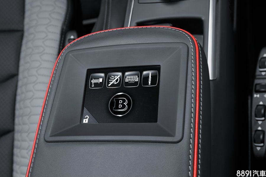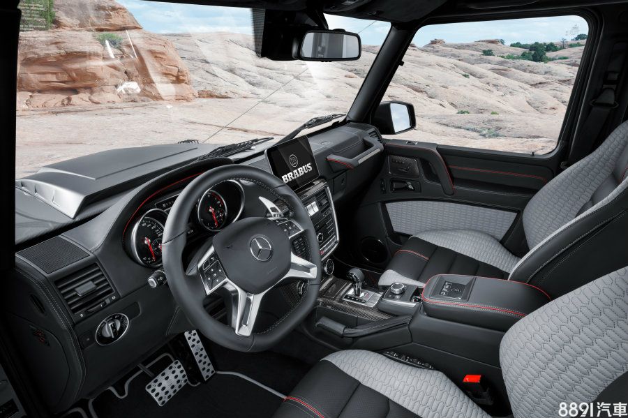 大家都知道,即使是一般的G-Class,在粗曠的外觀下,擁有的是頗為豪華的車艙設計,550 Adventure 4x4²也不例外,沿襲原有的鋪陳,Brabus於多處換上自家部件,如金屬踏板、門檻飾板等,當然也可依照客戶需求,提供客製化服務,車室色調以黑灰為主軸,加入紅色飾條增添些許競技味,座椅頭枕上的Brabus字樣,則可讓人一眼辨識其身分。