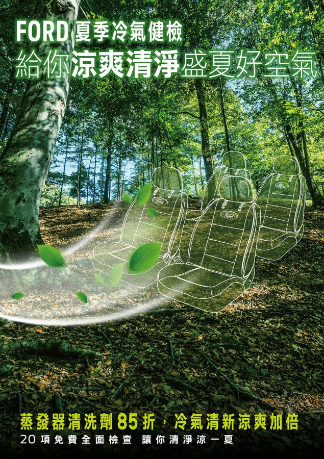 除了免費20項冷氣系統專業健檢服務外,同時,Ford亦推出蒸發器清洗劑85折優惠,為冷氣系統清除灰塵及髒汙,有效改善空氣異味,在盛夏體驗涼爽好空氣。