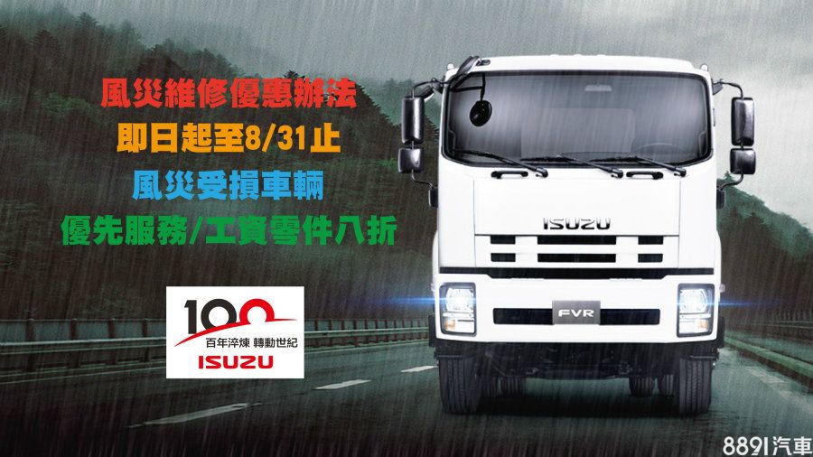 因本次風災造成導製致車輛受損者,除優先服務外,Isuzu另提供維修零件與工資八折優惠,希望能減輕車主負擔,並保障行車安全。而Isuzu台北合眾汽車特別提醒車主,隨時注意氣象動態並保持警戒,盡早留意愛車停放位置的安全性,如不幸愛車進水,切勿輕易發動,以免造成引擎損害,並可撥打台北合眾汽車即刻救援專線:0800-000-540,將提供全台24小時優質道路救援服務。