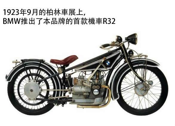 首款BMW品牌的機車R32在1923年9月發佈。前面提到BFW曾在1921年推出了一款名為Helios的機車,事實上它採用的同樣是BMW的M2B15引擎。在經過了嚴謹的解析評估之後,設計部負責人Friz得出了自己的結論:對於Helios機車最好的處理辦法是將它扔到河裏。Friz特別指出,Helios最大的問題出現在它的佈局中,對置雙缸引擎佈局嚴重影響了後面那個氣缸的散熱。