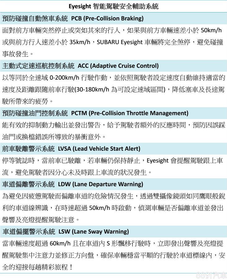 Eyesight安全輔助系統整合了PCB碰撞預防剎車、ACC主動式定速巡航、PCTM防暴衝油門控制、LVSA前車駛離警示、LDW車道偏離警示及LSW車道偏擺警示等功能;其中LDW能在50km/h以上偵測車輛偏離車道與否,而LSW則於60km/h以上判斷車輛是否蛇行,兩者均會以亮燈及聲響警示駕駛。