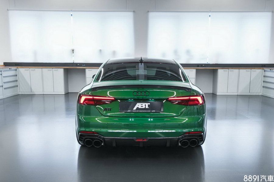 ABT沿用原廠顯眼的Sonomagrun Metallic綠色塗裝,在前保桿兩側加裝擾流鰭,換上式樣更具侵略性的碳纖維前下擾流,水箱護罩四周也施以碳纖維材質,並將四環廠徽予以亮黑塗裝,造就其兇悍且吸睛的面容。