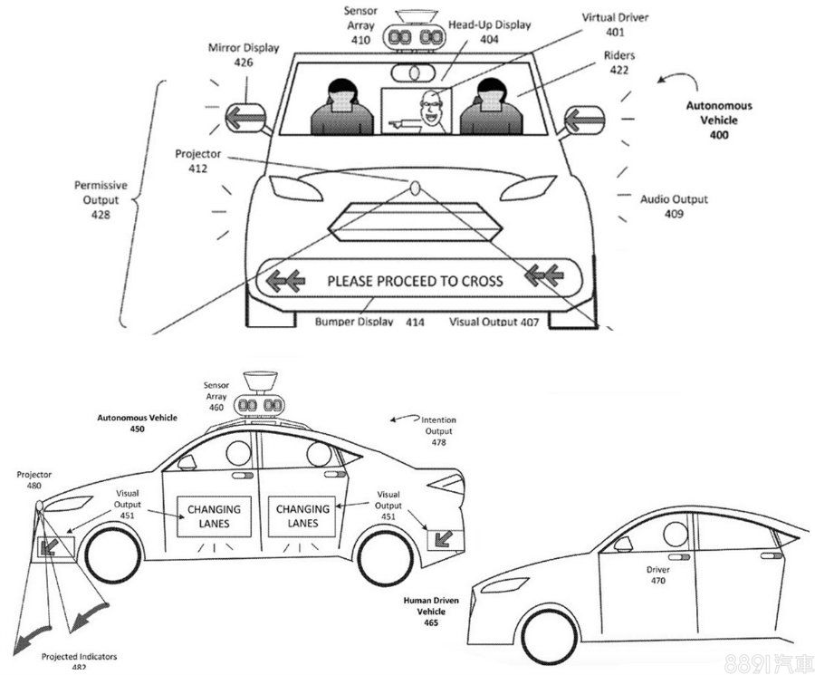 根據稍早流出的專利草圖顯示,Uber希望透過安裝Led面板、投射虛擬斑馬線以及後視鏡的箭頭導引等方式,建立用路人與自駕車之間的互動關係,不僅如此,為提升用路人辨識度,據稱該專利還會投影虛擬人物至擋風玻璃上,藉此讓人車互動更為直覺。