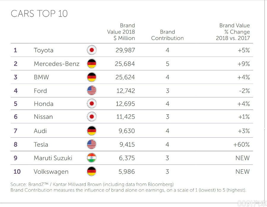 值得一提的是,今年VW首度擠進前十名,由於品牌過去因柴油風波事件,導致前2年無法入榜,經過一系列的應變措施以及人事調動後,目前集團整體形象邁入正軌。而觀察VW今年2018年第一季全球銷售狀況,目前已有152.3萬輛,表現相較於去年成長5.9%,品牌價值以59.86億美元作收。