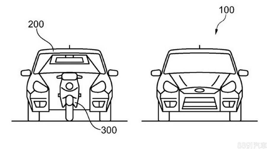 依照專利圖顯示,原廠將車頭引擎室空間改為置入機車,也因為車頭採分離式設計,因此驅動模式推測為後輪驅動,而中控台則有可能是與機車結合,讓其兼具資訊顯示與中控台操作等功能。至於機車座椅部分,不排除是作為前座扶手與置物空間使用。