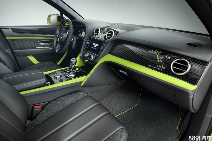 此次賓利僅限量推出10部的Bentayga特仕車,是以原先的W12車型為基礎,委由旗下客製化部門Mulliner所手工打造的,在車色部分,原廠提供了黑色(deep Beluga black)及與參賽車相同的螢光綠(Radium Satin)供消費者選購,而在車頭水箱護罩、下氣壩及左右進氣口等鍍鉻飾件則全數施以黑色高光澤烤漆妝點,加上前保桿下緣的碳纖維下擾流翼及22吋雙色塗裝鋁圈,流露出濃郁的跑格。