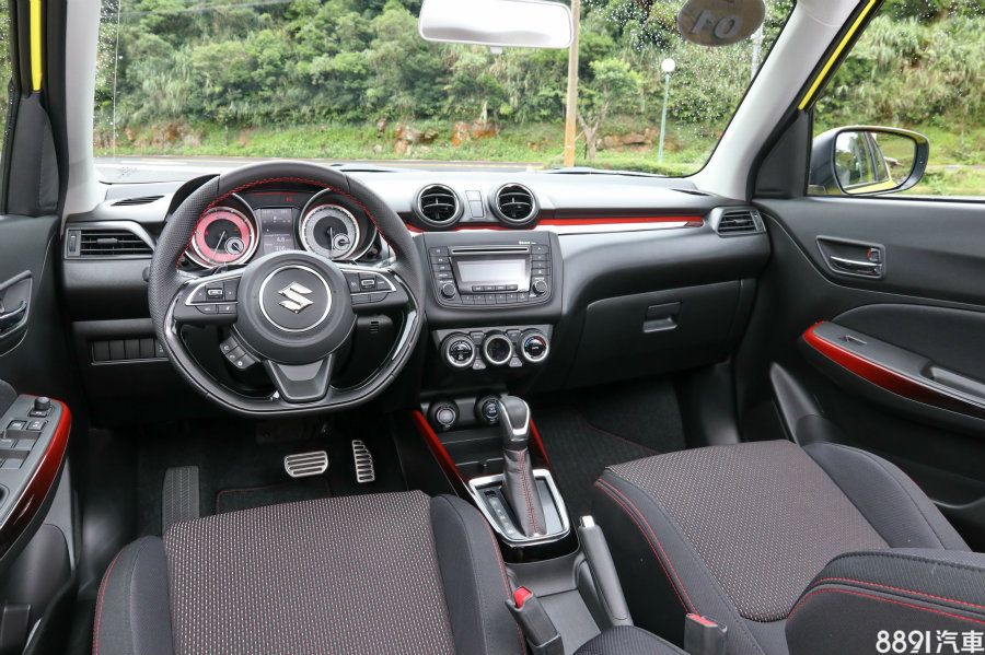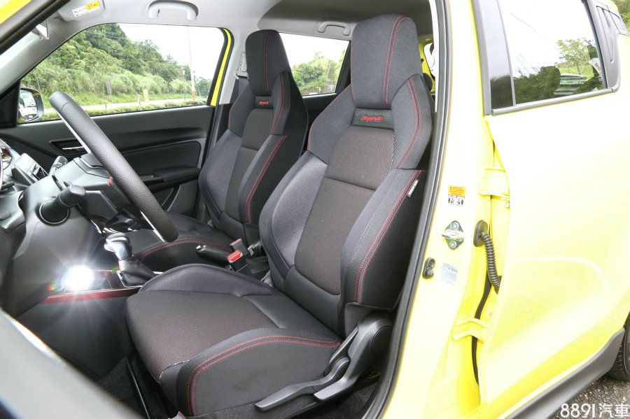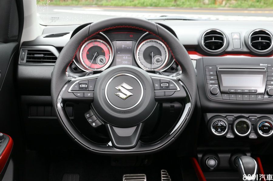 方向盤對比一般Swift,維持出色握感與換檔撥片的配置,表面的包覆皮質則多了透氣孔和紅色車縫線,並將下半部內緣改為黑色亮面材質。