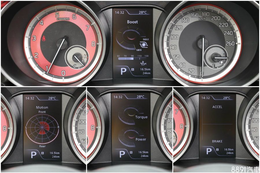 雙環式儀錶只有轉速部分採紅底色,算是個巧思,中央的資訊幕尺寸較一般Swift大,且多了增壓錶、機油溫度、G值、動力輸出以及油門開度等介面。