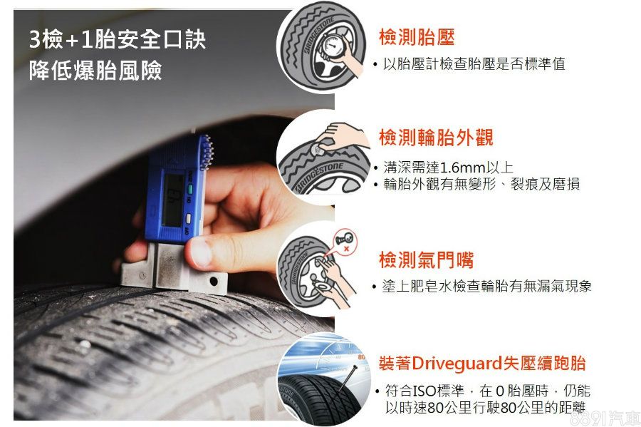 為了盡可能避免爆胎事故,行前應先檢查輪胎狀況。在輪胎檢驗方面,除了確認胎壓是否符合氣壓磅數標準值外,輪胎溝深也需達1.6mm以上,此外,還須檢查輪胎外觀有無變形、裂痕及磨損、氣門嘴是否有漏氣現象,或者直接加裝失壓續跑胎提升行車安全。