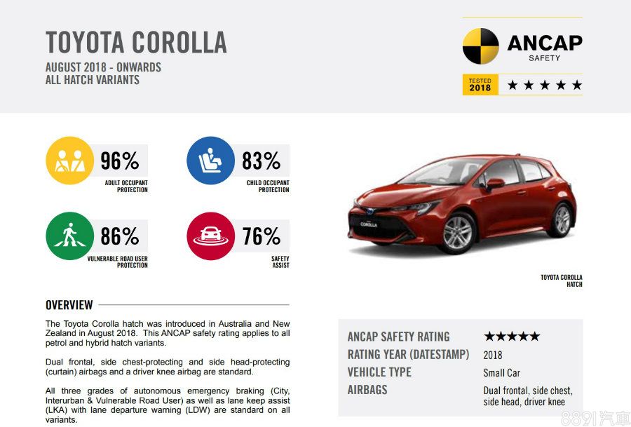 為驗證安全性,澳洲安全測試機構ANCAP針對剛上市的Auris(當地稱Corolla Hatch)展開相關測試,而根據報告指出,新車防撞性能以及安全配備均有一定水平,因此給予最高5星評等。