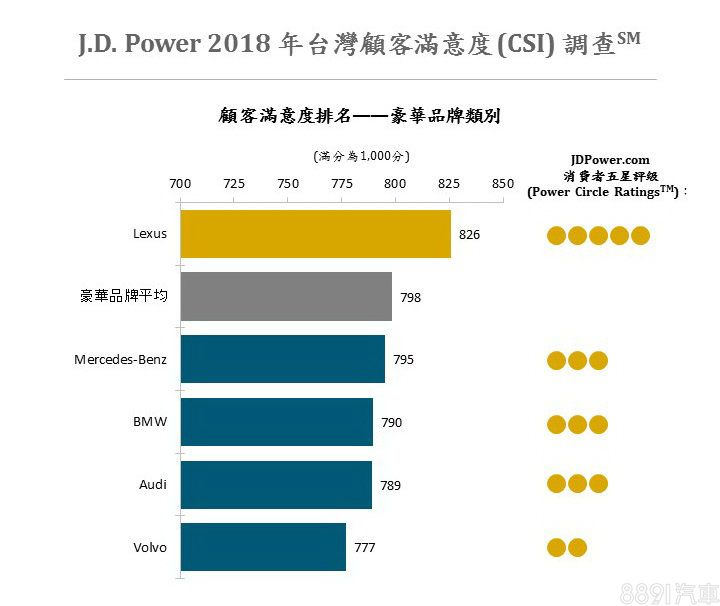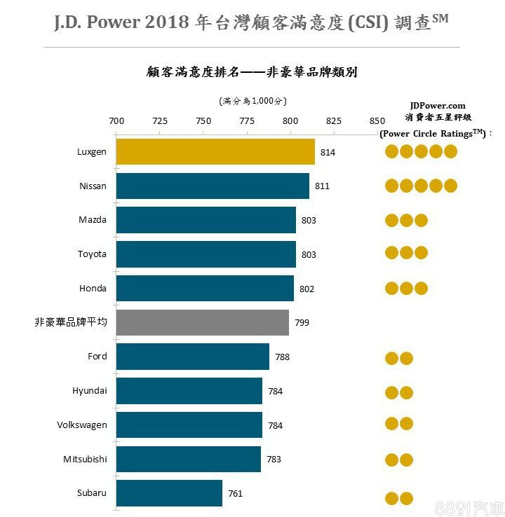 J.D. Power發表最新2018年台灣顧客滿意度(CSI)調查,以3198位非豪華品牌,以及1002位豪華品牌新車車主的回饋意見為依據,受訪對象為在過去12~36個月間購車、並於過去12個月間在授權經銷商或服務廠接受過至少一次保修服務的車主。調查主要根據服務品質(佔30%)、車輛提取(佔19%)、服務主動性(佔18%)、服務人員(佔17%)及服務設施(佔15%)。