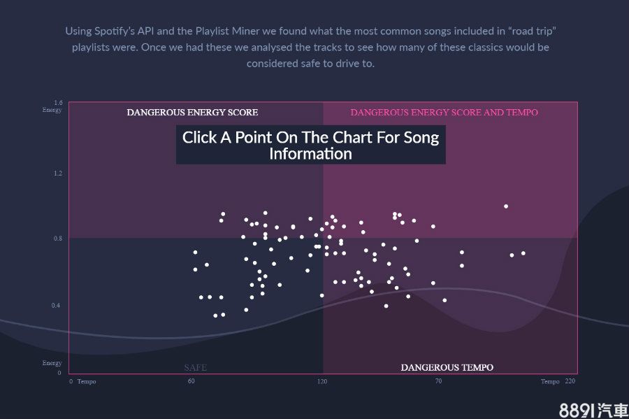 分析以歌曲的節奏曲速(bpm,拍/秒)與曲風活潑度(energy)兩特徵進行探究,並發現節奏較快、風格較高昂的歌曲,可能在無形間導致駕駛感到興奮;尤其當駕駛行車時聽著曲速逾120bpm的快板(Allegro)歌曲,有較大的機率出現超速或其他違規行為。