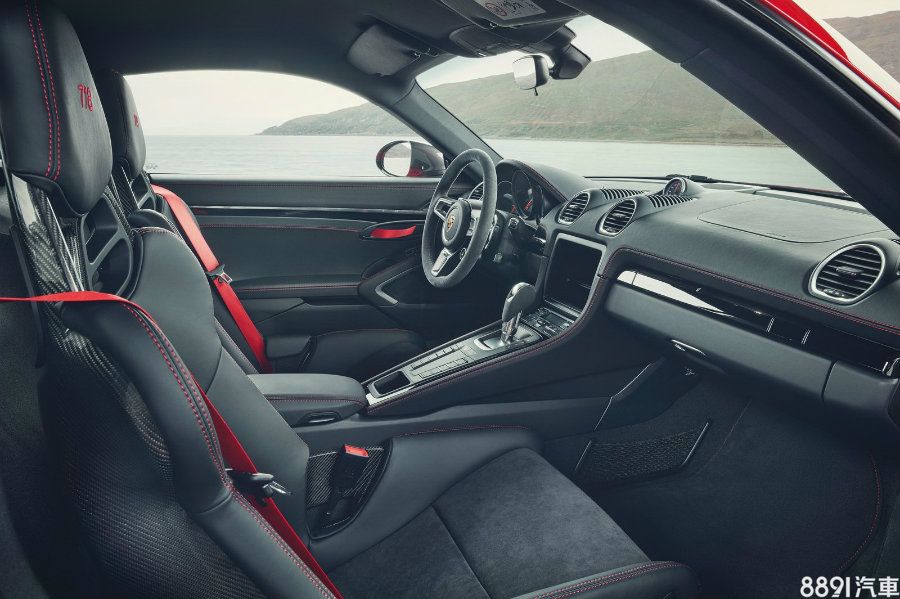 車室格局未變,但求減輕車重,拔除了搭載PCM的多媒體系統(依舊可選配),配置Sport-Tex皮革/布料混搭、頭枕有718徽飾的運動化座椅、專屬門檻飾板,儀錶上也擁有能顯示其身分的Cayman T和Boxster T字樣。
