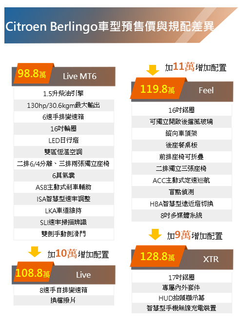 即將於國內開賣的三代Berlingo,甫於2018日內瓦車展上發表,採新世代EMP2模組化平台打造,國內導入的為長軸版,車身尺碼為4753x1848x1849mm、軸距達2975mm,為7人座設定,採Live MT6、Live、Feel和XTR共4車型編成,預售價分別為98.8、108.8、119.8和128.8萬元,較可惜的是,車展上並未展出實車,預計明年二季末可交車。