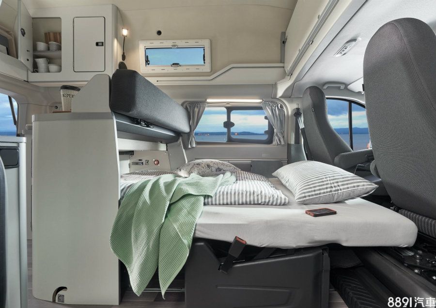車頂空間重新打造為臥房專用,不僅可容納雙人床,兩側亦配有氣窗來保持空氣流通,另外,考量機能結合姓,下方第二排座椅同樣設有折疊式臥鋪,讓全車乘客均能充分休憩。