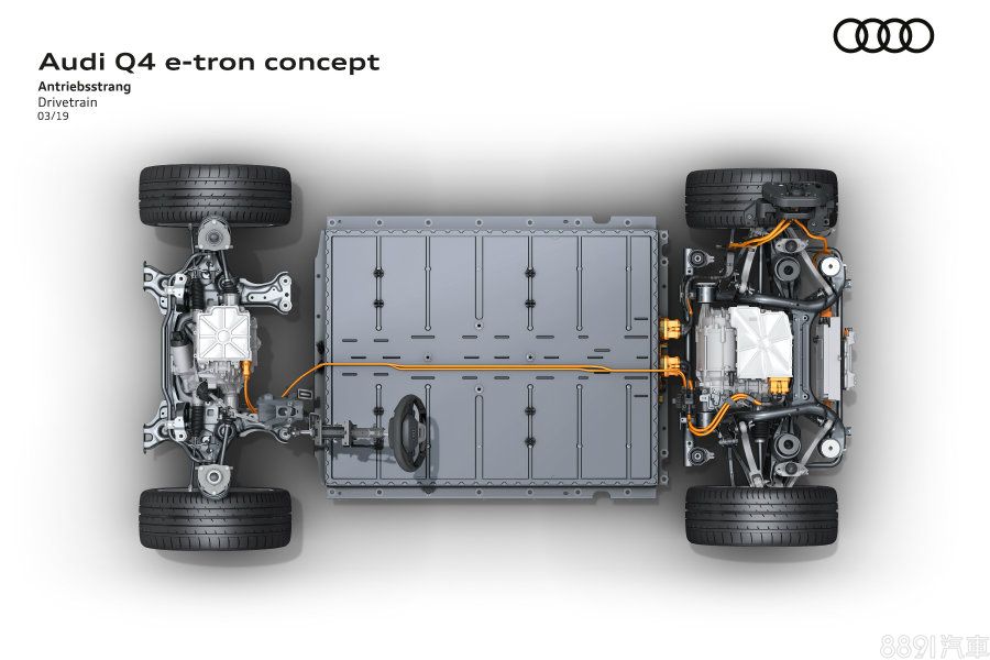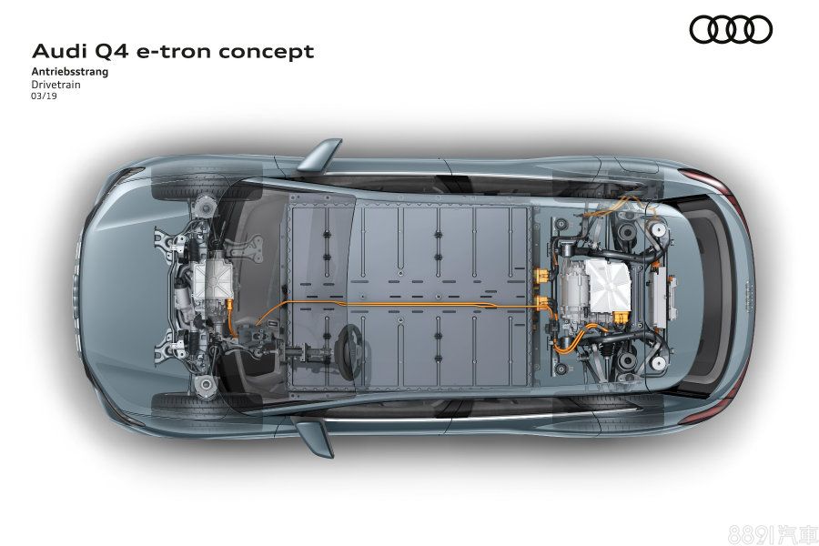 既然是預覽新世代作品,動力絕對是關注重點之一,在MEB底盤架構下,Q4 e-tron概念車採四輪驅動,並以「雙電動馬達+82kWh鋰離子電池組」作為配置,其中前軸電動馬達出力101hp/15.3kgm、後軸則繳出201hp/31.6kgm,不僅0~100km/h僅5.7秒,極速亦有180km/h。
