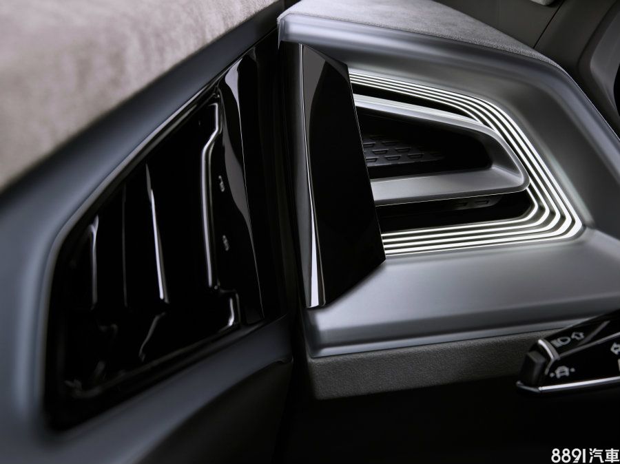 外觀以前衛風格呈現,修長的矩陣式LED頭燈具有科技感,八角水箱護罩則採封閉式格柵設計,配合前保桿兩側大型進氣壩,達到降低風阻效應,而要辨明純電身份,鑲嵌在前保桿的藍色e-tron字徽,自然是最好證明。