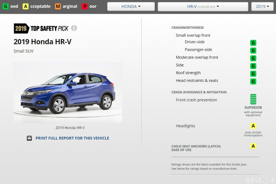 據資料顯示,雖然美規HR-V的頭燈與ISO-FIX操作表現略為失色,但前方偏位小面積撞擊、前方偏位撞擊、側面撞擊、車頂強度、頭枕及座椅等五項測試,撞擊成績均評定為最高級別「G」,加上Honda Sensing主動安全科技避免碰撞,故給予「Top Safety Pick」,僅次於最高評價「Top Safety Pick+」。