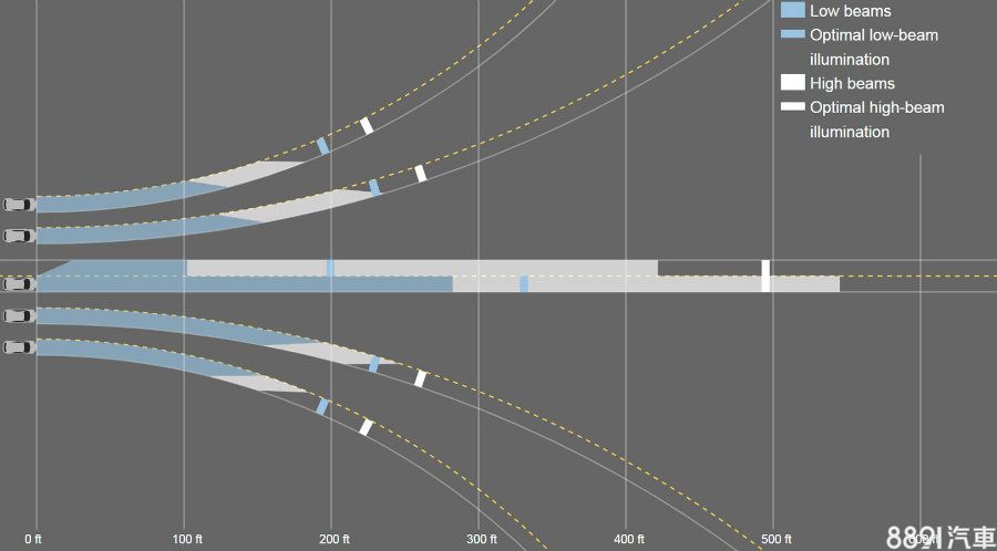 依照車型差異,IIHS分別針對提供LED頭燈與鹵素頭燈分別評比,雖然總體評價較往年更為進步,但在LED測試項目中,光源左側曲線照明略顯不足,僅獲得「A」評價,反觀鹵素頭燈,雖然右側照明尚可,但左側燈源不論是在直線或彎道照明範圍均明顯不足,被評定最末評價「P」。