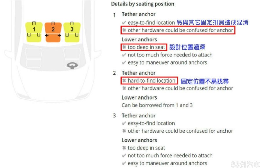 後座可安裝2組安全座椅,配有ISO-FIX固定扣環,但礙於設計位置過深,加上中央安全帶扣具容易造成操作混淆,故整體評價只有「A」評價。