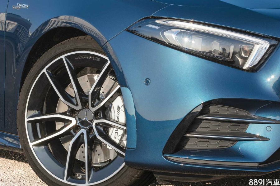 A 35 Sedan標配18吋輕量化鋁圈(可選19吋、如圖),為應付升級後的輸出,採用前四活塞卡鉗和350mm碟盤,以及後單活塞卡鉗和330mm碟盤的剎車系統。