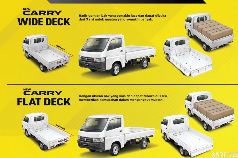 新一代Carry推出Flat Deck、Wide Deck兩種版本,車長和軸距同為4195、2205mm。論載運空間,前者擁有長2505mm、寬1665mm、高360mm之表現,後者則有長2505mm、寬1745mm、高425mm的空間,且為三面可開式貨斗設計,載重最高可達1.0噸。原廠表示,除了針對貨斗強化防鏽,並降低平台高度,提升實用性。