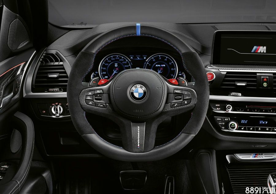 內裝方面,M Performance Pro方向盤握把兩側使用麂皮材質,握幅頂端中央還有一圈藍色飾環,功能鍵面板則為碳纖維用料。