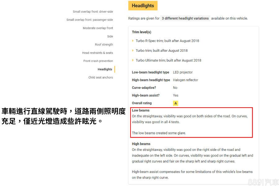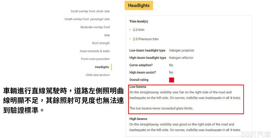 至於鹵素頭燈,雖然近光燈並未造成眩光,但礙於整體遠近光照明較為弱勢,為此IIHS僅給予較低的「P」評價,附帶一提,國內版本採上述LED頭燈配置,照明性更為良好。
