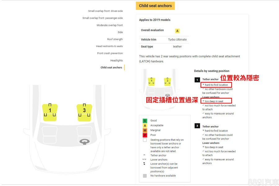 後座容許2組安全座椅進行安裝,並配有ISO-FIX固定扣環,可惜固定插槽位置過深,對於操作方面容易產生影響,因此同樣只有「A」評價。