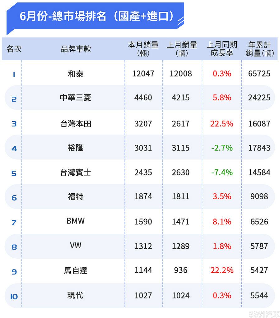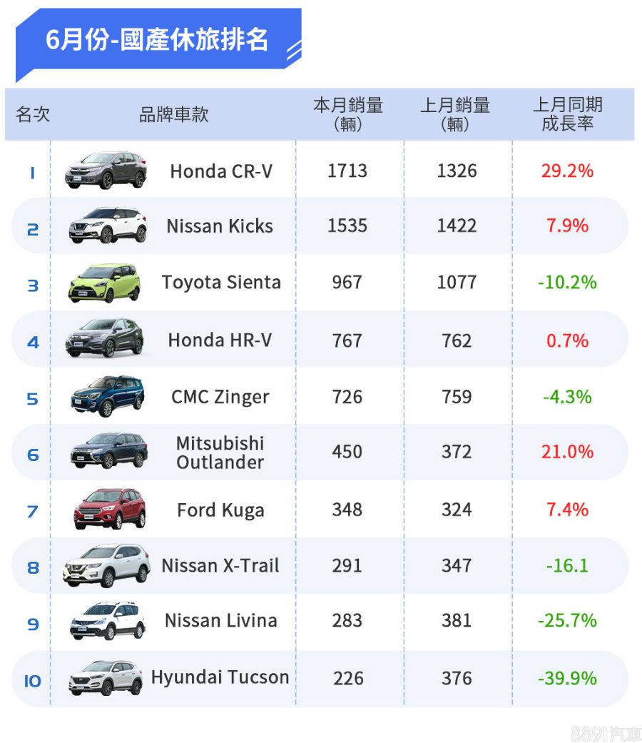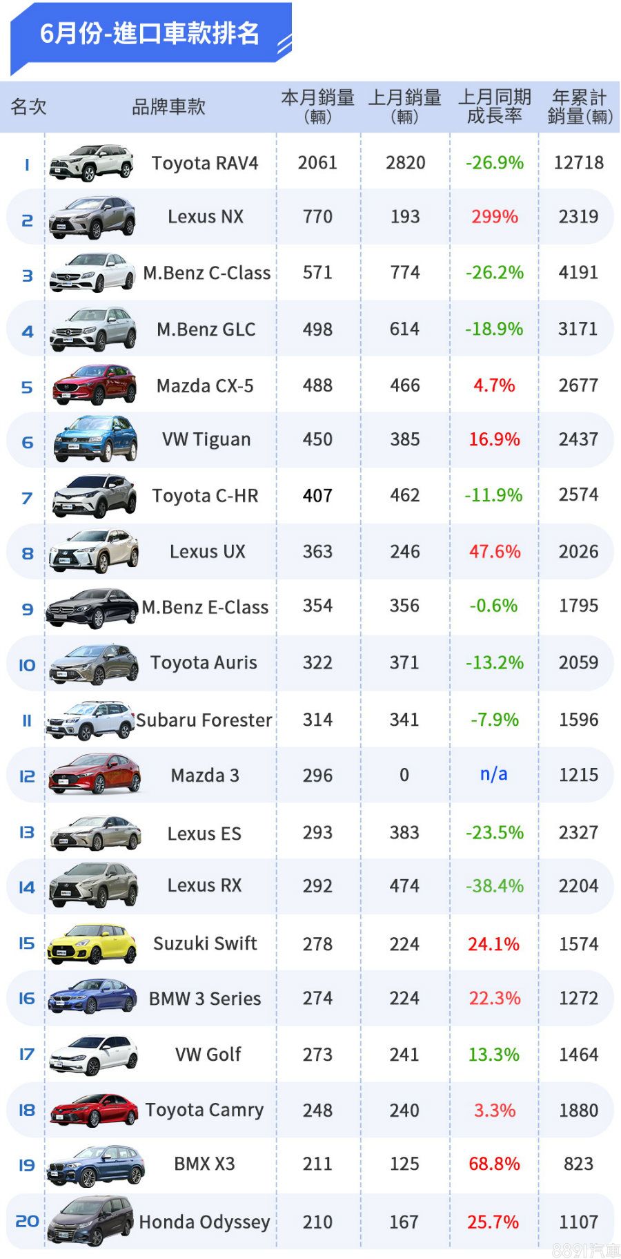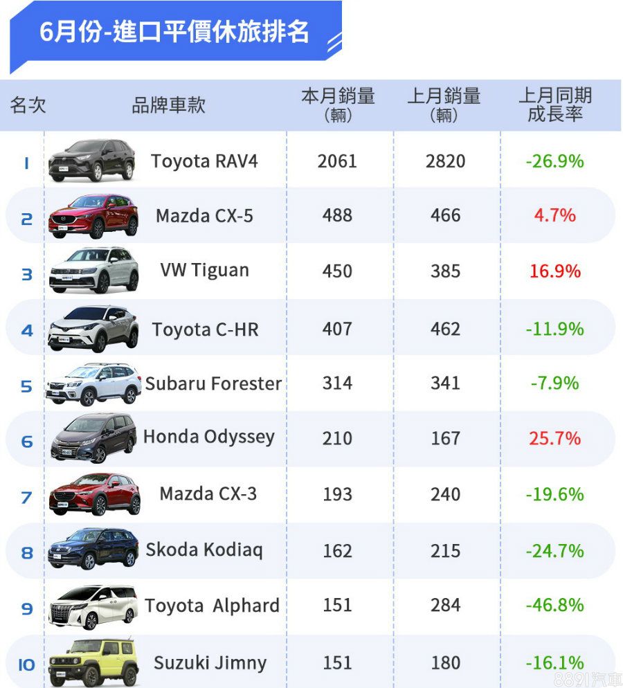 進口平價休旅前10名在6月銷量幾乎均為負成長,僅Mazda CX-5、VW Tiguan和Honda Odyssey有較為亮眼的表現。